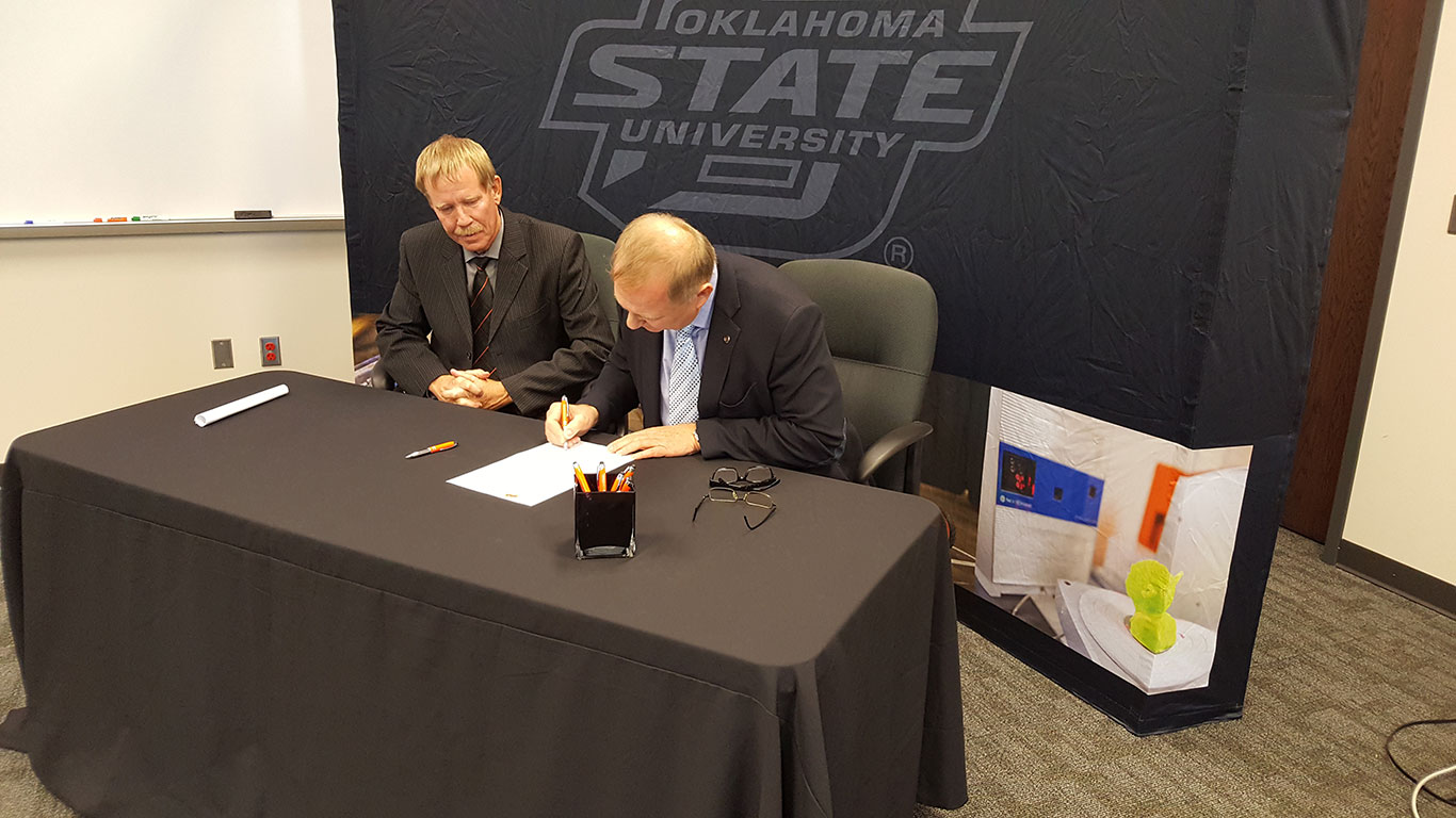 On Sept. 11, 2016, Aircraft Towing Systems World Wide LLC President Stan Malicki signs a contract with Oklahoma State University New Product Development Center Director Ron Taylor for the design and development of the ATS system prototype at OSU in Stillwater, Oklahoma.