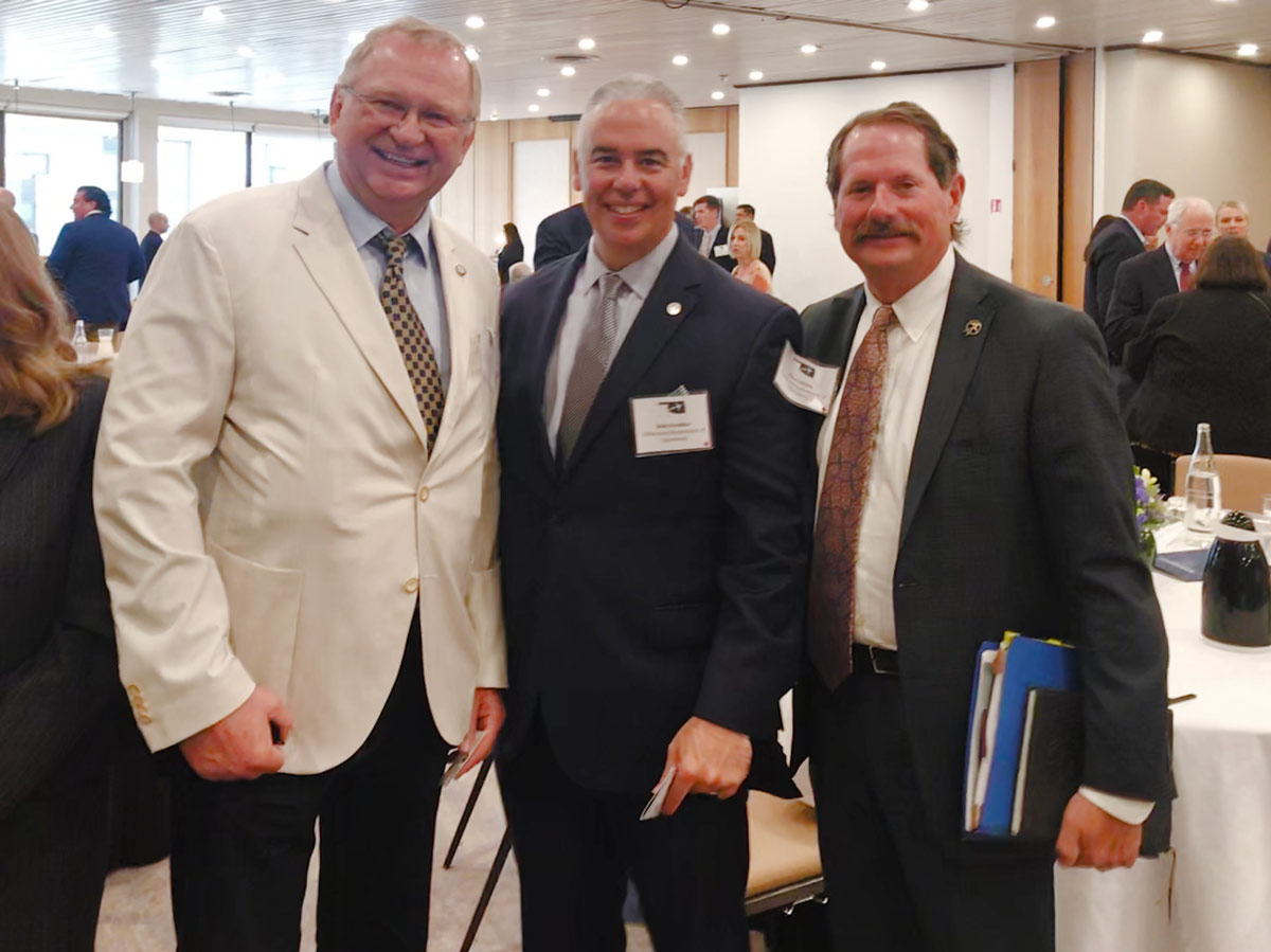 (LR) Aircraft Towing Systems (ATS) World Wide President Stan Malicki and ATS VP/CEO Vince Howie pause for a photo with Oklahoma State Secretary of Commerce & Workforce Development Sean Kouplen (center) during the Oklahoma Aerospace Breakfast held June 16, 2019 at the Hyatt Regency Étoile Paris, France. The event was held in conjunctio