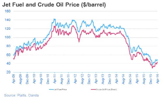 One of the major advantages of implementing ATS system for aircraft transport at an airport is significant fuel savings. Aircraft engines (on medium and large airfields) burn an average 35 liters or 9 gallons of fuel per minute during taxi. Depending on the type and size of aircraft, fuel usage can very 20-70 liters or 5-18 gallons per minute during taxi. For example, taxi time at Frankfort Airport averages 16 minutes per flight, which translates to burning approximately 560 liters or 148 gallons of fuel on every aircraft movement. Utilizing the ATS system allows the aircraft to power down the main jet engines shortly after landing and conversely, the aircraft is not required to use their main jet engines during taxi until reaching the runway for take-off and only to perform the required engine run-up just prior to takeoff. Prices of fuel have a significant impact on the amount of savings from fuel usage; see graph below.
