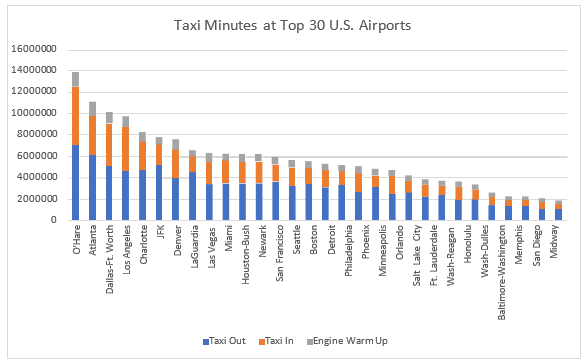 Taxi time greatly influences the fuel consumption of an aircraft. Approximately 25% of all commercial aircraft are wide-body aircraft, which consume an average of 70 liters or 19 gallons of fuel per minute during taxiing. The remaining 75%-80% of large commercial aircraft are mid-size aircraft, which burn an average of 22 liters or 6 gallons of fuel per minute during taxiing. The overall average of passenger aircraft burns about 35 liters or 9 gallons of fuel per minute. Calculations indicate that the fuel required to taxi is approximately 3%-4% of the entire fuel consumed for flight operations (take-off, flight and landing). In addition, fuel used during taxiing results in large amounts of harmful emissions released into the atmosphere. The table below shows taxi times for the busiest US airports:
